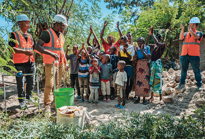 坦桑尼亚姆万扎卫星城供水项目是中非共建“一带一路”倡议下的重要民生工程。图为在坦桑尼亚姆万扎省米松圭,凯尔文(左二)与同事接通水管后赢得当地居民鼓掌欢呼(2023年6月13日摄) 王冠森摄/本刊